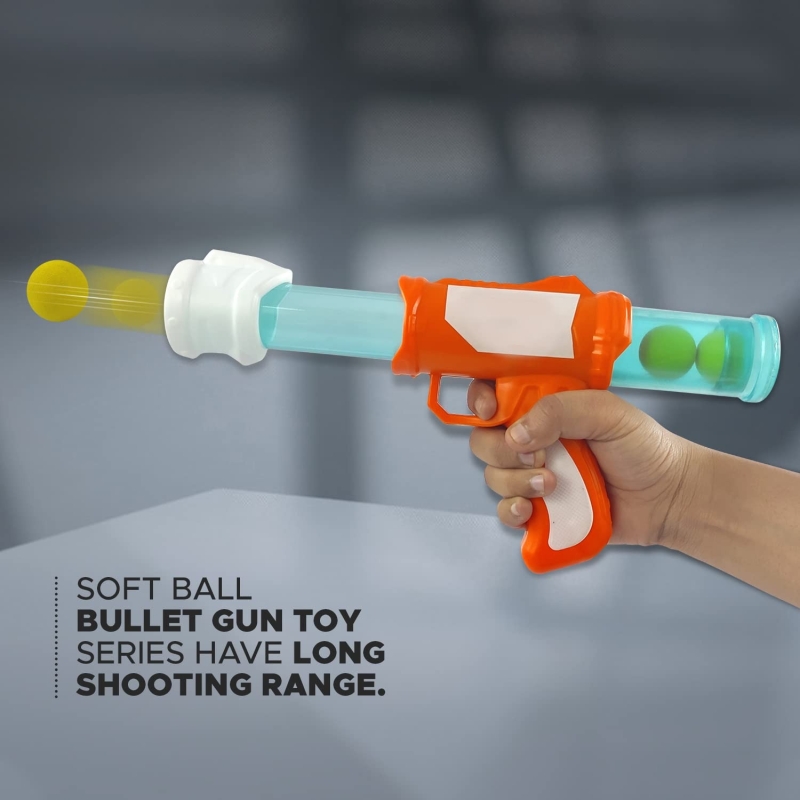 Load each toy gun with 1 soft foam ball at a time, cock, aim, and knockdown all gun targets from up to a shooting range; these toy guns are compatible with others.